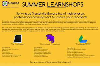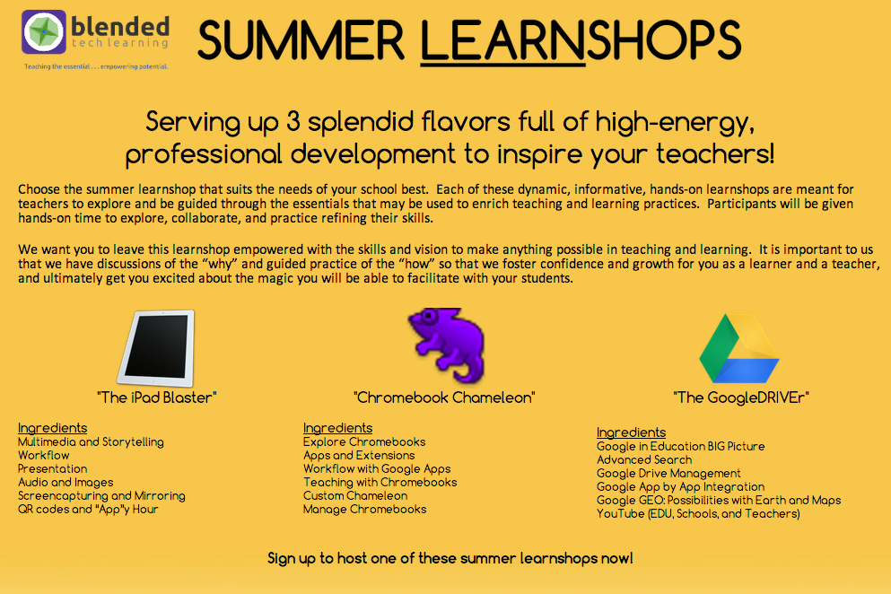 We are offering three different full-day sessions technology integration of iPads, Chromebooks, and Google Apps. See summer.blendedtechlearning.com for details.